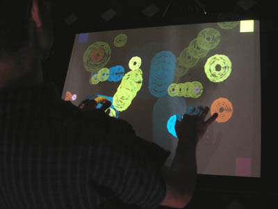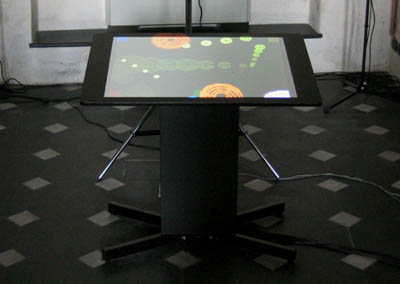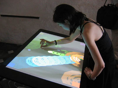 Technical note: This installation consists of a touch sensitive table with images projected from the ceiling. When users tap on the table, rose-like graphics are displayed at the point of contact and the raw sound created by the impact is processed in real-time in order to produce more elaborated sounds. Parameters such as the force of impact is controlling the size of the roses. Different sounds and graphical behaviour can be selected by taping on visual buttons at the four corners of the table. Both impact positions and sounds are recorded in loops, allowing the users to create complex visual and sonic patterns. Another button at the bottom of the table allows to erase the loops. The table is made sensitive thanks to acoustic sensing technologies developed in the context of the European project of research TAI-CHI (Tangible Acoustic Interfaces for Computer-Human Interaction).